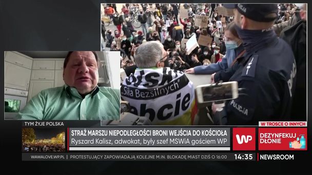 Orzeczenie Trybunału Konstytucyjnego pod kierownictwem Julii Przyłębskiej w sprawie aborcji wywołało falę protestów w całej Polsce. Mimo rosnącego zagrożenia epidemicznego na ulice polskich miast i małych miejscowości wyszli obywatele niezgadzający się z decyzją TK. Protestujący winą za tę sytuacje obciążają między innymi Kościół Katolicki w Polsce, dlatego też część niedzielnych protestów odbywała się przed budynkami kościołów, jak i w samych świątyniach. Do jednej z najbardziej intensywnych demonstracji doszło przed kościołem św. Krzyża w Warszawie, gdzie wejścia do kościoła strzegli przedstawiciele ONR i Marszu Niepodległości. O opinię w tej sprawie poprosiliśmy gościa programu Newsroom, byłego ministra spraw wewnętrznych i administracji Ryszarda Kalisza.