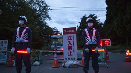 Zamknięta droga prowadząca do strefy zero w okolicach miejscowości Minami-Soma. Szlabanu strzegą japońscy policjanci.