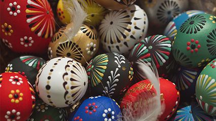 Pisanki to z kolei jaja, na których rysuje się precyzyjne wzory z roztopionego wosku, a następnie moczy się je w barwniku. Czasem efekt końcowy przypomina prawdziwe dzieło sztuki.