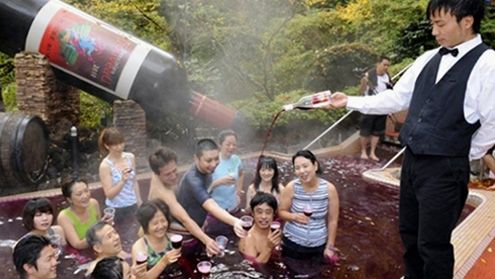 Stąd też Japończycy mają zwyczaj świętowania dnia Beaujolais. Na zdj. goście w basenie w Hakone Yunessun Spa w miejscowości Hakone, jednym z największych japońskich uzdrowisk z gorącymi źródłami. Goście kąpali się i pływali w odkrytym basenie napełnionym czerwonym winem.