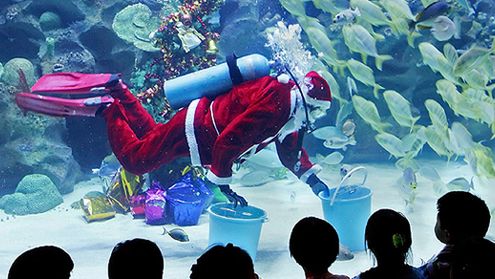 Dzieci przyglądają się karmieniu ryb przez płetwonurka w stroju Świętego Mikołaja w wielkim akwarium w Kuala Lumpur w Malezji. W akwarium o powierzchni 5 400 metrów kwadratowych mieszka ponad 5 tysięcy słodkowodnych i morskich ryb.