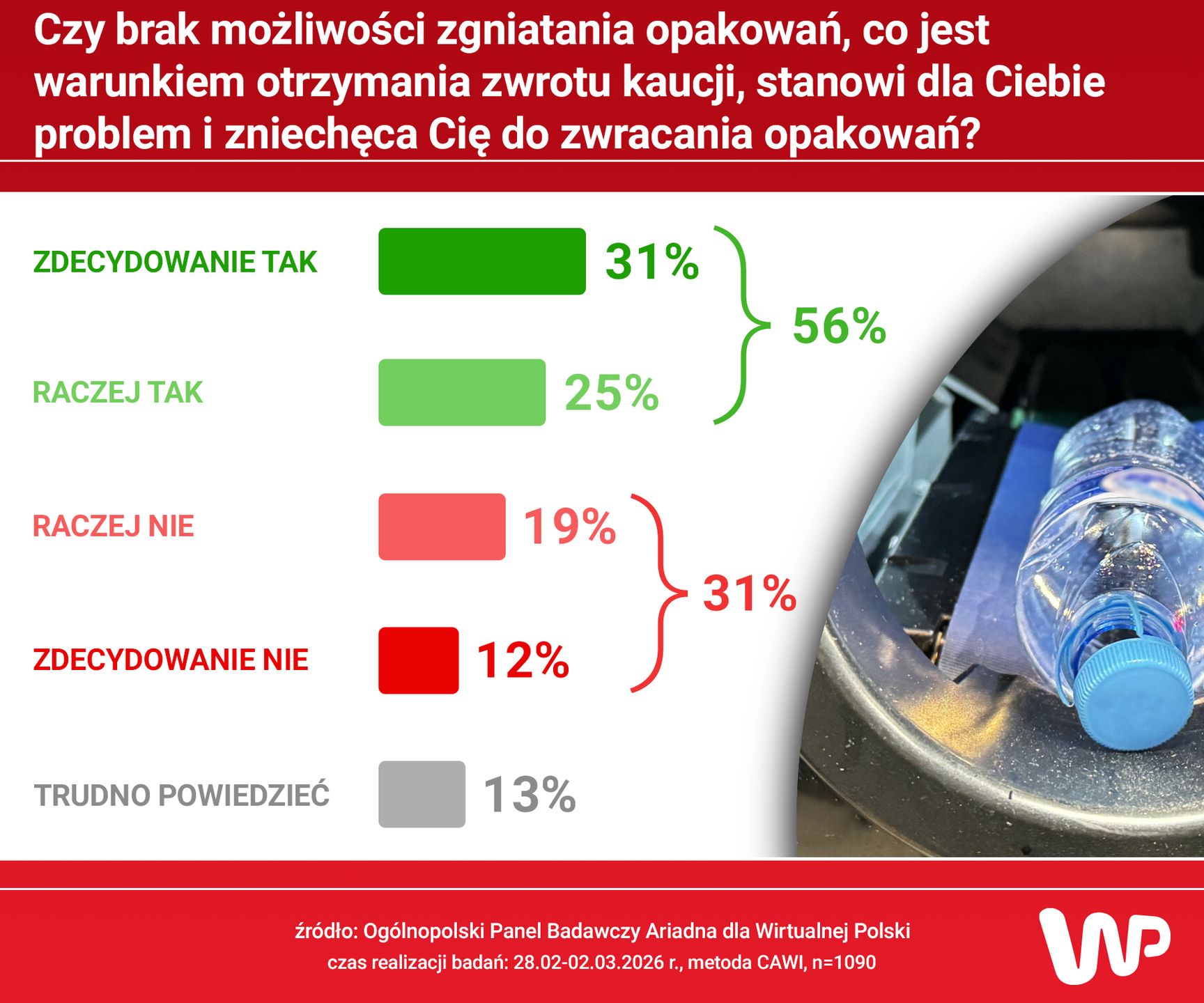 Zupełnie inne zdanie ma 31 proc. respondentów. Dla nich brak możliwości zgniatania nie stanowi większej przeszkody (19 proc. wskazało odpowiedź "raczej nie", a 12 proc. "zdecydowanie nie"). Grupa osób, która nie ma wyrobionej opinii w tej sprawie lub wybrała odpowiedź "trudno powiedzieć", stanowi 13 proc. badanych.