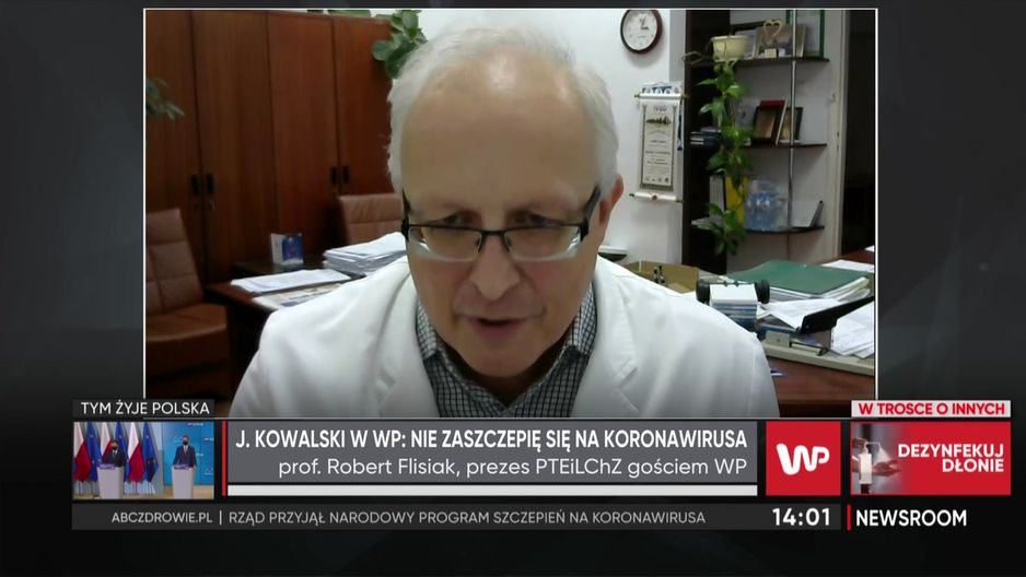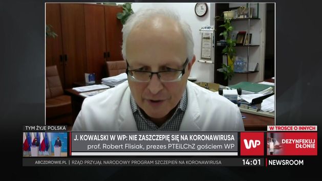 Prezes Polskiego Towarzystwa Epidemiologów i Lekarzy Chorób Zakaźnych prof. Robert Flisiak skomentował w programie "Newsroom WP" słowa wiceministra aktywów państwowych Janusza Kowalskiego na temat szczepień. Kowalski stwierdził publicznie, że nie zamierza się szczepić przeciwko koronawirusowi. Prof. Flisiak przypomniał, że wcześniej publicznie przeciwko szczepionkom wypowiadał się prezydent Andrzej Duda, ale zmienił zdanie, więc możliwe, że również Kowalski je zmieni. Dodał jednak, że jeśli tak się nie stanie, to skorzysta na tym kto inny, bo skróci się kolejka do szczepień. Ekspert odniósł się również do pomysłu wprowadzenia systemu benefitów dla osób zaszczepionych. W jego ocenie koncepcja zakładająca udogodnienia dla osób posiadających certyfikat szczepienia jest dobra, ponieważ prowadziłaby do ograniczenia rozprzestrzeniania się koronawirusa.