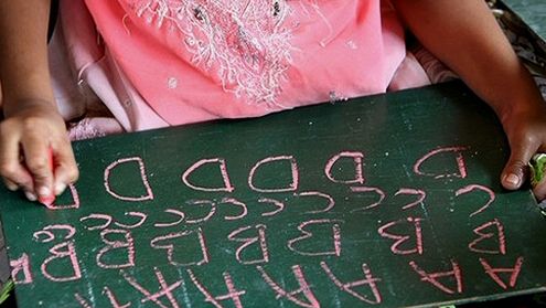 Dziewczynka pisze kredą alfabet na tabliczce.