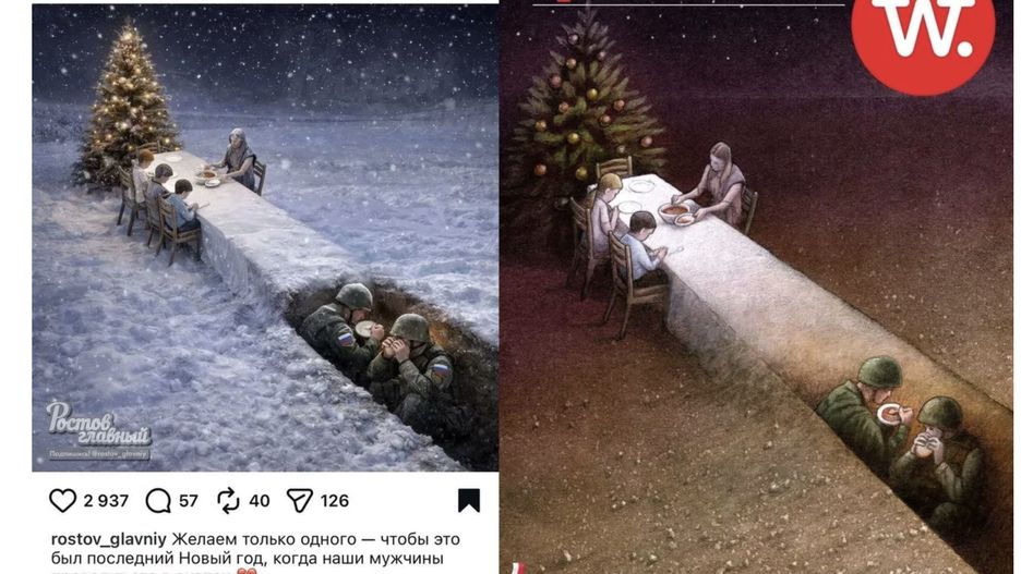 Oryginalna praca Pawła Kuczyńskiego przedstawiała żołnierzy siedzących w okopie, który symbolicznie przechodził w świąteczny stół, przy którym siedzi samotna matka z dwójką dzieci. Tymczasem rosyjski serwis Rostov Glavniy, który ma 230 tys. obserwujących, bez skrupułów i szacunku do praw autorskich wykorzystał cudze dzieło.