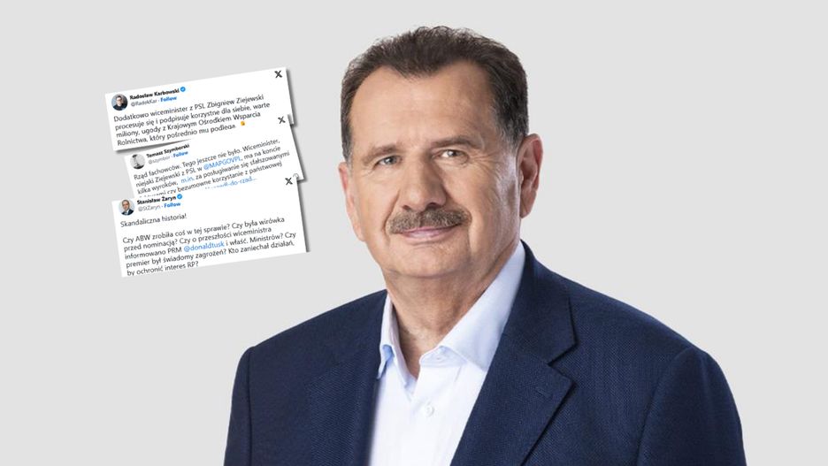 "Dodatkowo wiceminister z PSL Zbigniew Ziejewski procesuje się i podpisuje korzystne dla siebie, warte miliony, ugody z Krajowym Ośrodkiem Wsparcia Rolnictwa, który pośrednio mu podlega" - napisał dziennikarz Radosław Karbowski.
