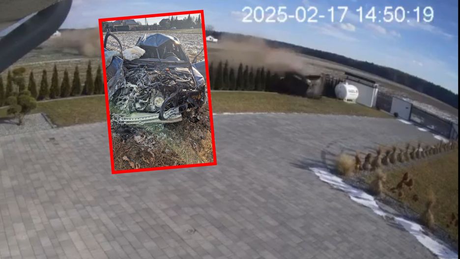 Lubelska policja opublikowała szokujące nagranie. Widać na nim pędzący samochód, który "przelatuje" nad ogrodzeniem i zatrzymuje się na pobliskim polu. Samochodem uciekał 20-latek, który wcześniej ranił nożem swojego młodszego brata.