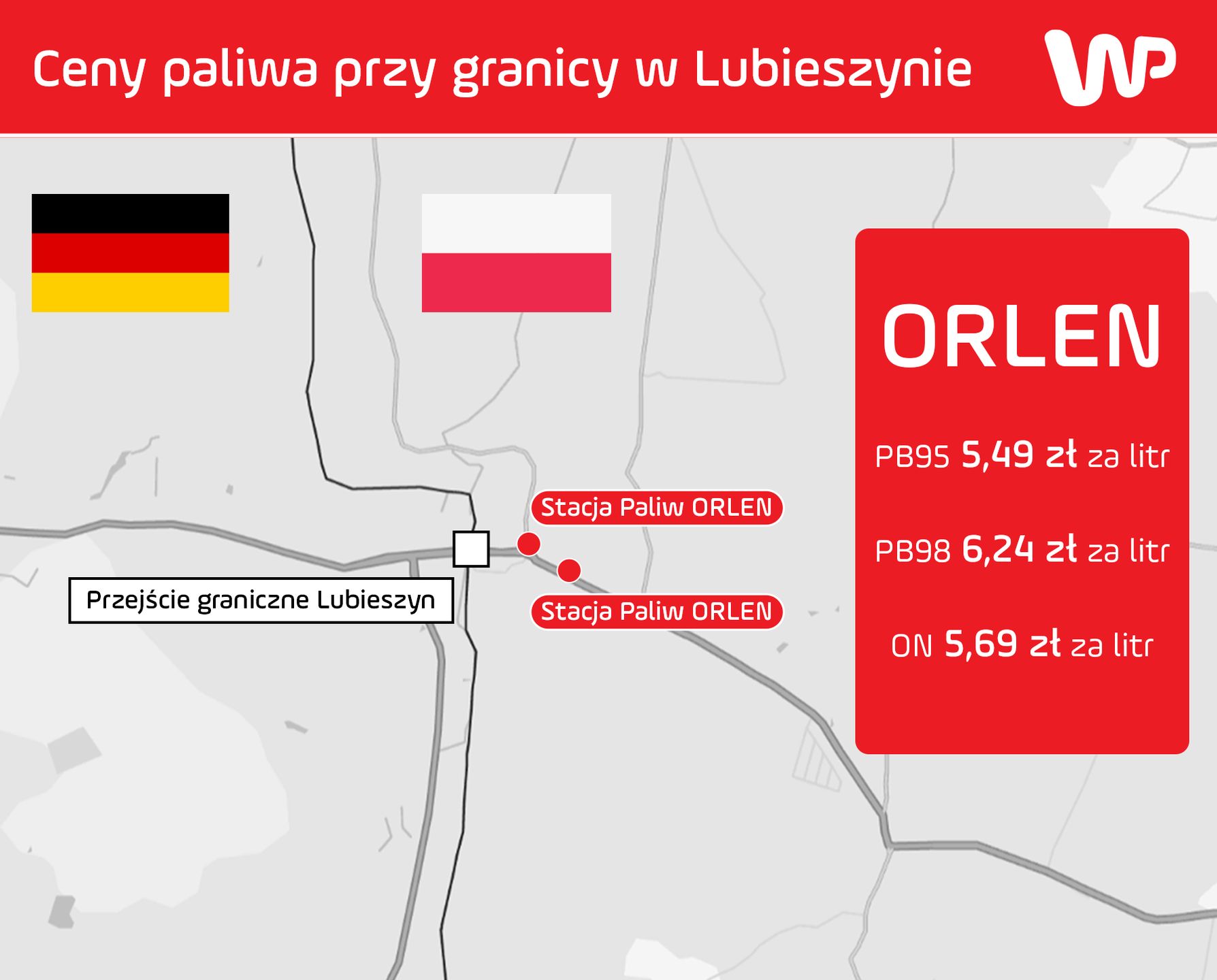 Na pylonach dwóch stacji Orlen znajdujących się przy przejściu na drodze krajowej nr w Lubieszynie paliwo PB95 jest po 5,49 zł za litr, PB98 w cenie 6,24 zł za litr a olej napędowy po 5,69 zł za litr.