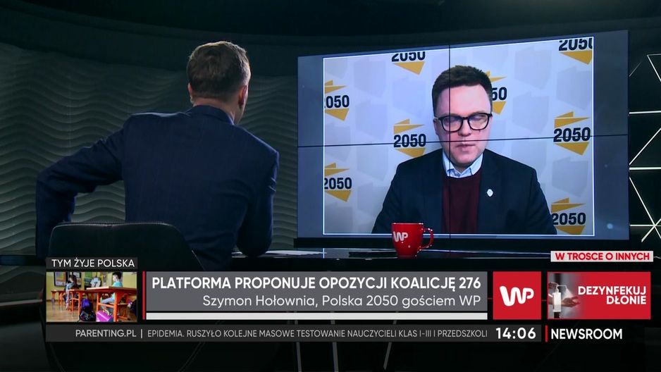 Szymon Hołownia odniósł się do propozycji PO, która chciałaby stworzyć szeroką koalicję opozycyjną. Podkreśla, że nikt nie zapytał o zdanie szefów partii, do których zwraca się PO. Hołownia posłużył się tu zabawnym porównaniem do kogoś, kto ogłasza światu, że żeni się z Claudią Schiffer, tylko jej o zdanie nie zapytał. Lider Polski 2050 zaznacza, że woli "wyjść do ludzi z efektem, a nie z propozycją, że kiedyś będzie można coś wypracować". Przypomina, że PiS pokonał zjednoczoną opozycję już sześć razy w wyborach. Polityk powątpiewa, czy kolejna koalicja powinna się tworzyć pod sztandarem PO. - Być może ten czas już minął, a karty muszą być inaczej rozdane - mówi. Hołownia pyta również, czy zdobycie 276 posłów w Sejmie jest celem samym w sobie. Lider Polski 2050 uważa, że przekaz powinien zawierać konkrety, czy coś uzgodniono lub wypracowane elementy. - Nie mam śmiałości wychodzić do ludzi i opowiadać, że z kimś porozmawiałem - podsumowuje były dziennikarz.