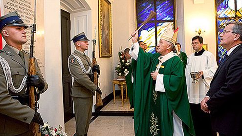 Bronisław Komorowski w kaplicy Pałacu Prezydenckiego odsłonił tablicę upamiętniającą prezydenta Lecha Kaczyńskiego, jego małżonkę, prezydenta Ryszarda Kaczorowskiego, ministrów i pracowników Kancelarii. W uroczystości uczestniczyły rodziny tragicznie zmarłych.