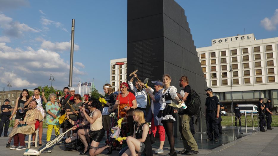 Przebrani aktywiści dzień przed miesięcznicą smoleńską zebrali się na placu Józefa Piłsudskiego w Warszawie, aby posprzątać Pomnik Ofiar Tragedii Smoleńskiej.