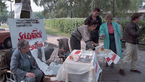 Wybory do Sejmu i Senatu 4 czerwca 1989 roku były przełomowym okresem w historii Polski. Tego dnia rozpoczął się pochód Polaków ku wolności. Punkt informacyjny "Solidarności" przed lokalem Obwodowej Komisji Wyborczej (Pałac Kultury i Nauki) na placu Defilad.