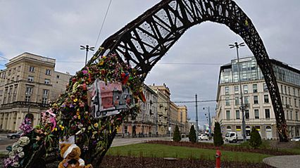 Na zdjęciu pluszowy miś akcji WOŚP pod hasłem: "Nie bij mnie - kochaj mnie!" obok spalonej instalacji "Tęcza".