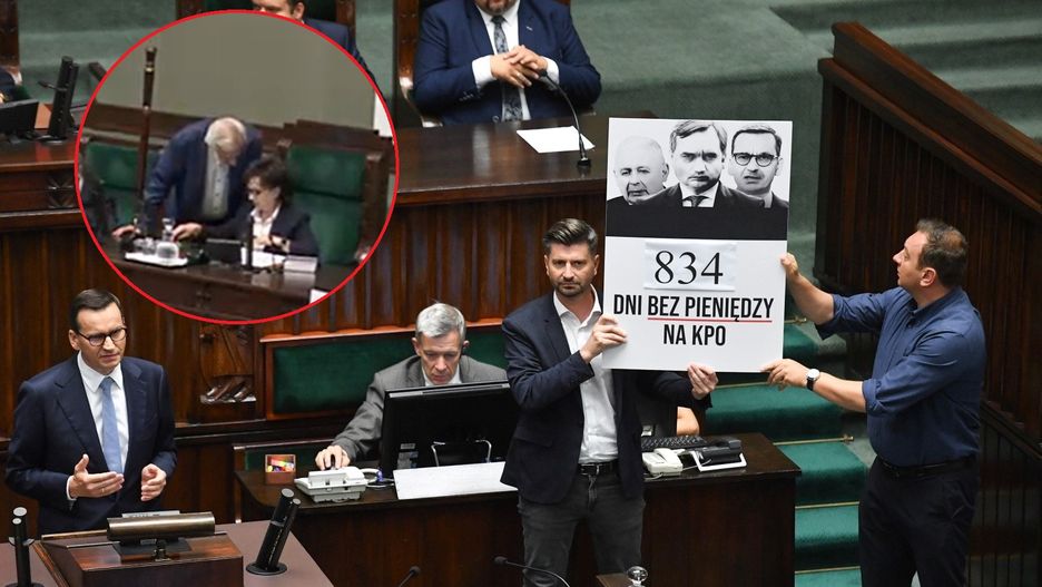 W Sejmie doszło do awantury. Posłowie opozycji pojawili się na sali plenarnej z banerem, który uderza w PiS. Tomasz Trela i Krzysztof Śmiszek prezentowali transparent w trakcie wystąpienia Mateusza Morawieckiego. Premier był zagłuszany przez śmiech i okrzyki. Przed dłuższą chwilę w ogóle nie było słychać, co mówi.