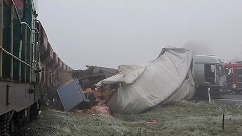 Kierowca tira nie zachował należytej ostrożności, przez co pociąg towarowy wjechał w naczepę samochodu.