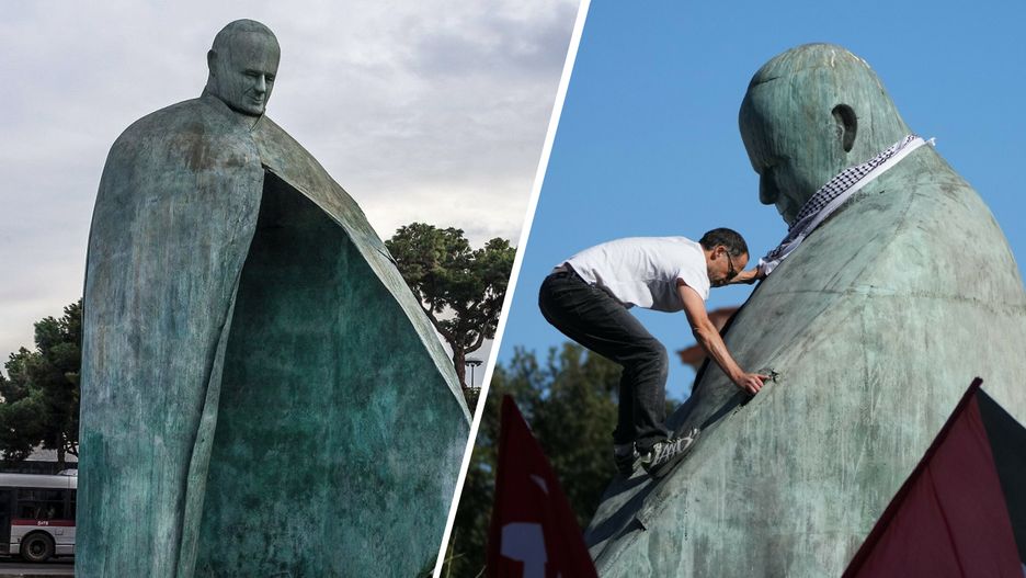W Rzymie od końca września odbywają się manifestacje solidarnościowe z ludnością Strefy Gazy. Po kolejnej pikiecie na odsłoniętym w 2011 roku na pomniku Wojtyły pojawił się obraźliwy napis oraz rysunek sierpa i młota. Karabinierzy szybko przystąpili do usuwania farby z pomnika, a akt wandalizmu wywołał powszechne oburzenie.
