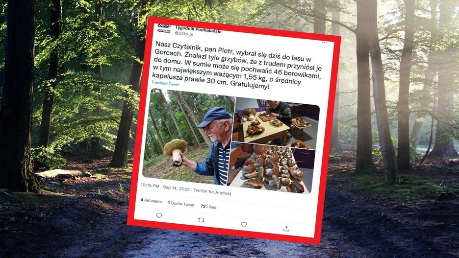 Czytelnik "Tygodnika Podhalańskiego" zebrał łącznie 46 borowików. "Znalazł tyle grzybów, że z trudem przyniósł je do domu" - wskazała prasa.