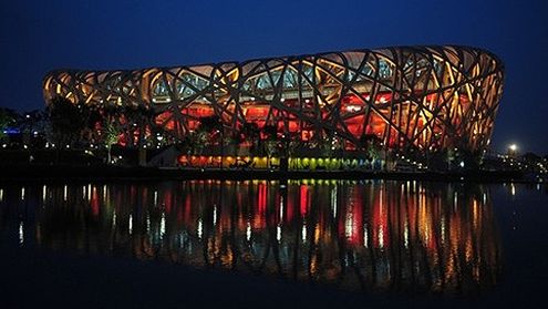 Stadion Narodowy w Pekinie - "Ptasie Gniazdo", podświetlony podczas próby ceremonii otwarcia igrzysk.