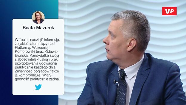 - Kompromituje się takimi wpisami. Wstyd, że polityk, w taki sposób potrafi odnosić się do innej osoby - stwierdził Tomasz Siemoniak oceniając wpis europosłanki PiS Beaty Mazurek na temat Małgorzaty Kidawy-Błońskiej, kandydatki Koalicji Obywatelskiej na prezydenta. "W 'bulu i nadzieji' informuję, że jakieś fatum ciąży nad Platformą" napisała na swoim profilu na Twitterze była rzeczniczka rządu. Zarzuciła też kandydatce "słabość intelektualną i brak przygotowania". - Odradzam pani Beacie Mazurek Twittera, gdy nachodzi ją taka żółć i frustracja. Lepiej niech przeczyta książkę - dodał. Zdaniem Siemoniaka politycy powinni unikać takich sformułowań, bo jak stwierdził "tweety nie płoną".