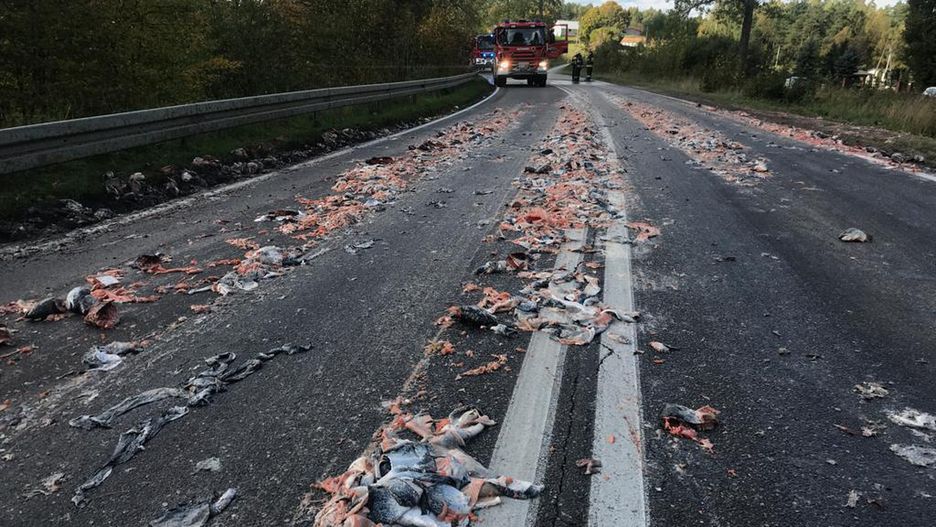 Pomorskie. Szczątki ryb na drodze. Doszło do wypadku