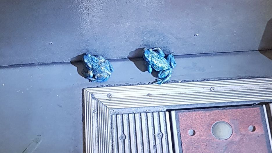 Nie wiadomo kto wpadł na pomysł pomalowania płazów na niebiesko i wypuścił je w tramwaju. Trwa analiza nagrania z kamer monitoringu.