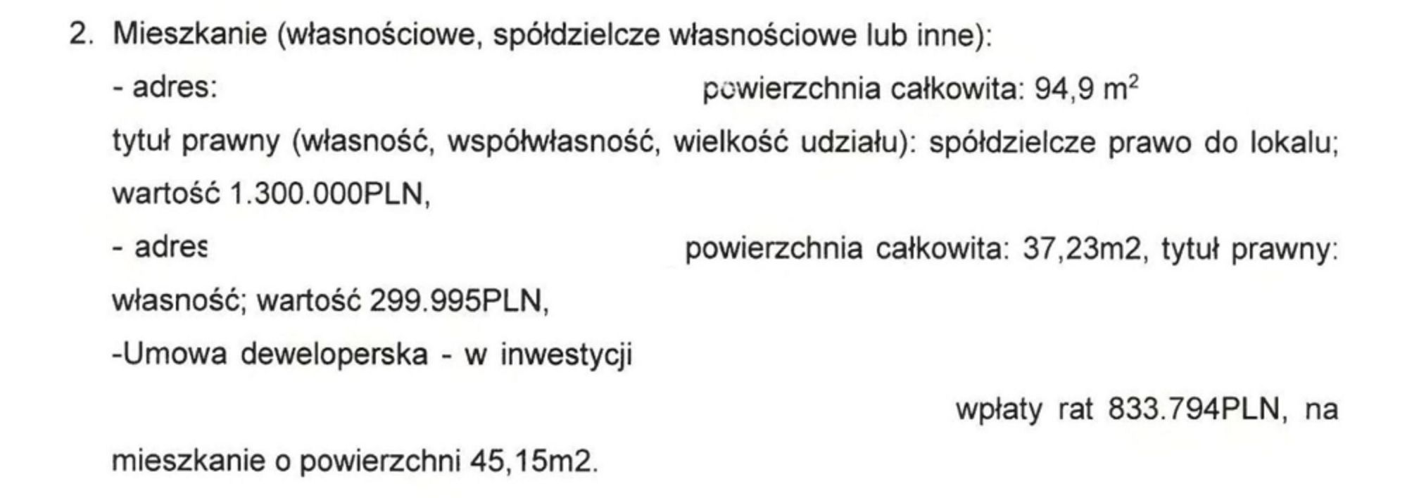 Czesław Siekierski wskazał, że jest właścicielem dwóch mieszkań o powierzchni 94,9 m2 (szacowana wartość 1 mln 300 tys. zł) i 37,23 m2 (szacowana wartość 299 tys. 995 zł). Zawarł też umowę deweloperską na lokal o powierzchni 45,15 m2.