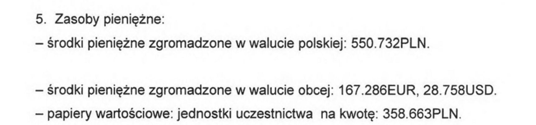 Na koncie bankowym Siekierski zgromadził 550 732 zł, 167 tys. euro i 28 758 dolarów amerykańskich. Ponadto posiada też papiery wartościowe na kwotę 358 663 zł.