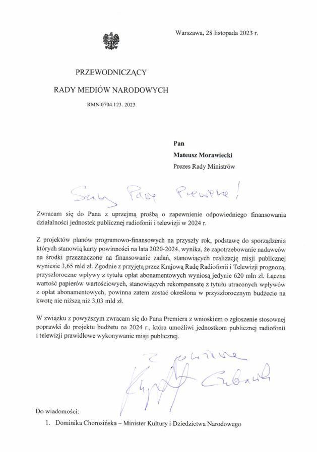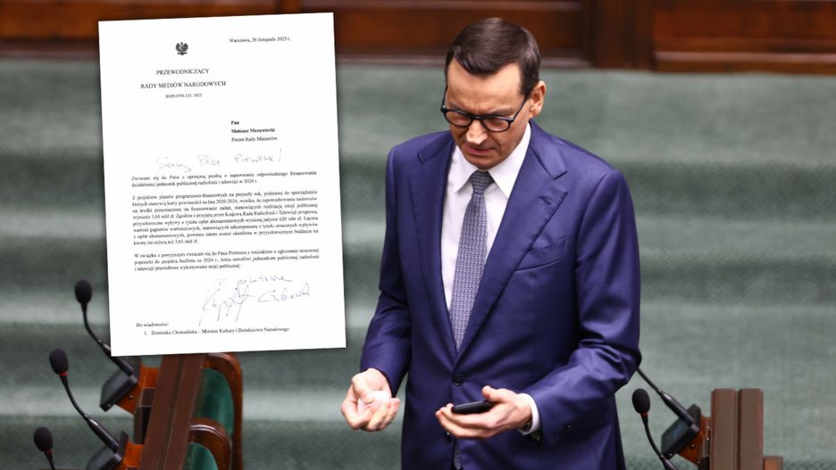 "Zwracam się do Pana z uprzejmą prośbą o zapewnienie odpowiedniego finansowania działalności jednostek publicznych radiofonii i telewizji w 2024 r." - napisał Czabański we wniosku do premiera.