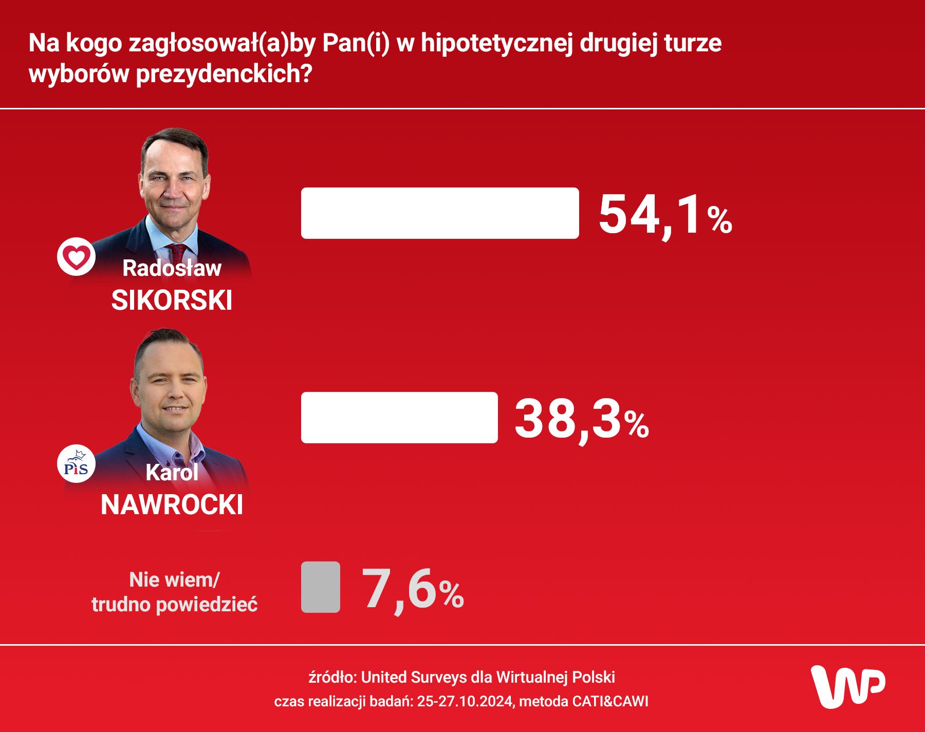 W sytuacji, w której KO wystawiłaby Radosława Sikorskiego, a PiS - Karola Nawrockiego, ponownie - wg sondaż WP - zwyciężyłby kandydat Koalicji Obywatelskiej. W tym przypadku różnica jest jednak mniejsza. Poparcie dla Radosława Sikorskiego zadeklarowało 54,1 proc. badanych, zaś dla Karola Nawrockiego - 38,3 proc.