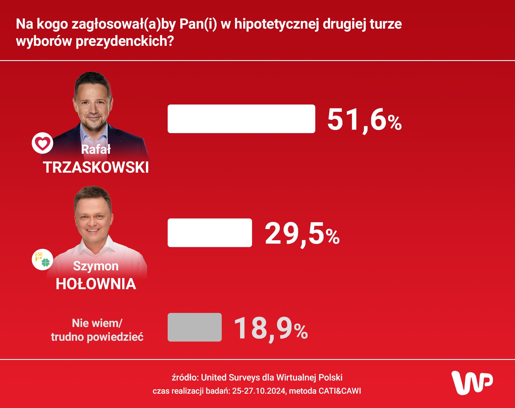 Badania United Surveys dla Wirtualnej Polski przeprowadzono w dniach 25-27 października 2024r. na próbie n=1000. Badanie zrealizowano metodą mix-mode online oraz telefonicznych, standaryzowanych wywiadów kwestionariuszowych wspomaganych komputerowo (CAWI / CATI).