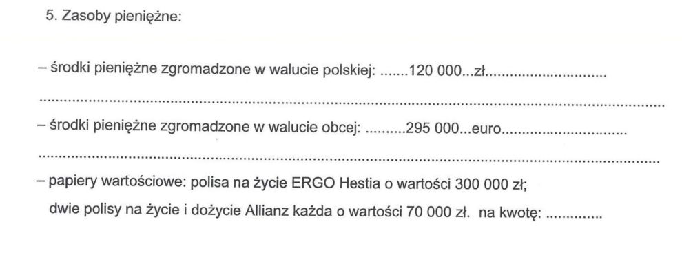 Na koncie bankowym premier zgromadził 120 tys. zł i 295 tys. euro. Posiada też papiery wartościowe, w tym polisę na życie o wartości 300 tys. zł, a także dwie inne polisy na życie i dożycie - każda o wartości 70 tys. zł.