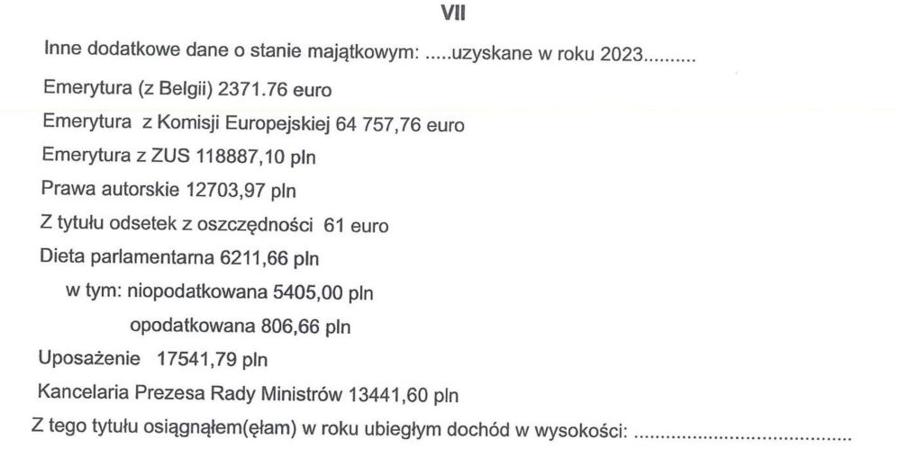 W 2023 roku Tusk uzyskał następujące przychody: emerytura (z Belgii) 2 371,76 euro, emerytura z KE 64 757,76 euro, emerytura z ZUS 118 887 zł, prawa autorskie 12 703 zł, a także z tytułu odsetek oszczędności 61 euro, dieta parlamentarna 6 211 zł, uposażenie 17 541 zł, Kancelaria Prezesa Rady Ministrów 13 441 zł.