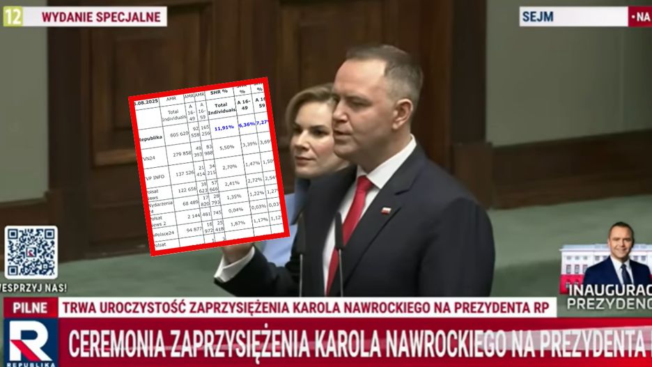 W dniu zaprzysiężenia Karola Nawrockiego na prezydenta Polski, TV Republika zdominowała rynek telewizyjny. Stacja osiągnęła 11,91 proc. udziału, co uczyniło ją liderem oglądalności w kraju - wynika z danych Nielsen.