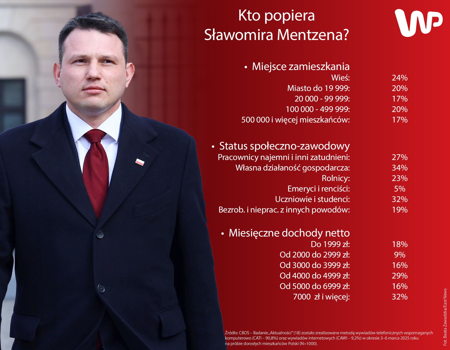 Co więcej, Mentzen, tak jak Konfederacja, "przeprowadził się na wieś". W 2019 roku partia dostała 6,9 proc. w miastach i 6,4 proc. na wsi. W wyborach z 2023 roku była już bardziej wiejska niż miejska (8 proc.). Dziś Mentzen dostaje w sondażu CBOS głos co czwartego mieszkańca wsi.
