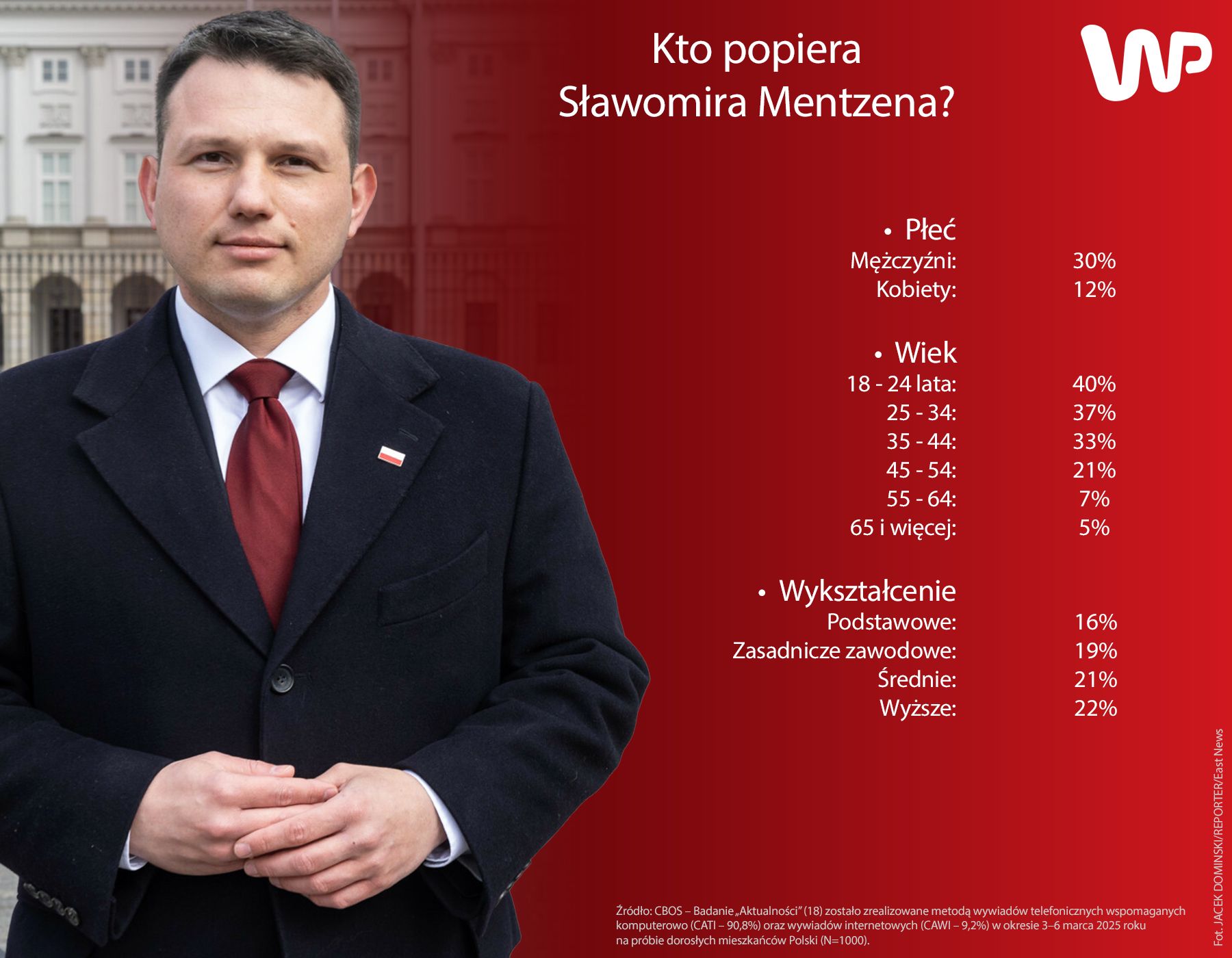 Tak, Mentzena popierają dziś dwukrotnie częściej mężczyźni niż kobiety oraz młodsi niż starsi. Ale wystarczy spojrzeć głębiej, by przekonać się, że zaszła znacząca zmiana. Według danych CBOS z początku marca Mentzen wygrywa nie tylko z Nawrockim, ale i z Trzaskowskim, w trzech grupach wiekowych: 18-24 (40 proc.), 25-34 (37 proc.) i 35-44 (33 proc.). Dopiero w grupie 45+ traci na rzecz innych kandydatów.