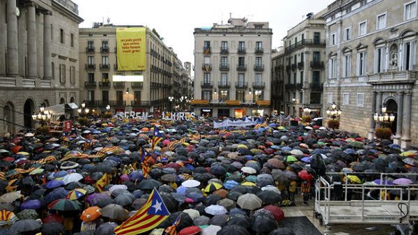 W ulewnym deszczu zwolennicy referendum zebrali się przed merostwami w Barcelonie i innych katalońskich miastach, domagając się prawa do przeprowadzenia referendum.
