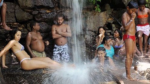 Miejscowi chłodzą się w wodospadzie na wzgórzu Corcovado, znajdującym się po drodze do posągu Chrystusa Zbawiciela. Temperatury w fali upałów, która nawiedziła miasto, sięgają 40 stopni Celsjusza.