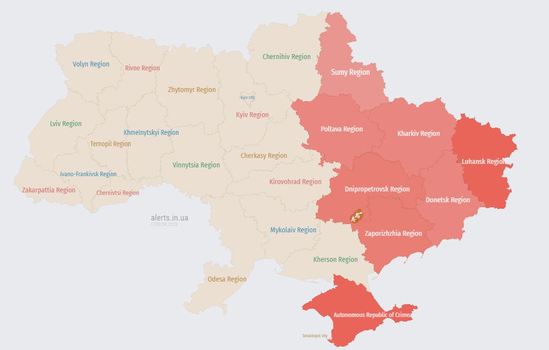 Mapa alarmów przeciwlotniczych w Ukrainie.