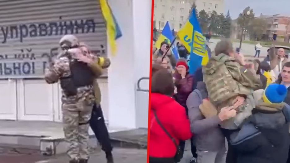 Chersończycy zgotowali żołnierzom gorące powitanie. Są okrzyki "Chwała Ukrainie, chwała bohaterom", uściski.