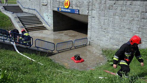 Strażacy wypompowują wodę z zalanej stacji metra Wilanowska