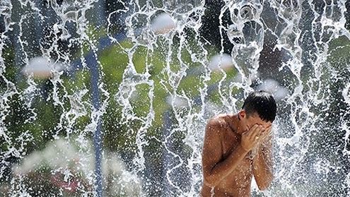 Bukareszt, mężczyzna z psem chłodzą się w fontannie, temperatura przekroczyła 36 stopni Celsjusza