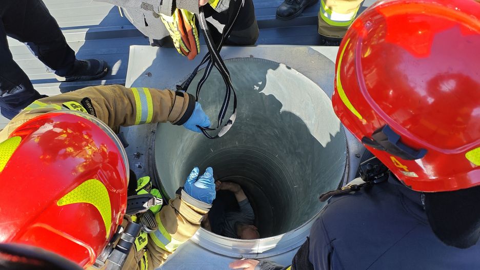- Jakie działania podjęły służby? Strażacy zdemontowali kolano wylotowe szybu, umożliwiając ewakuację poszkodowanego, który następnie został przekazany policji.