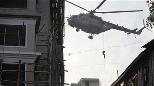 Komandosi opuszczają się z helikoptera na dach budynku Nariman House w Bombaju.