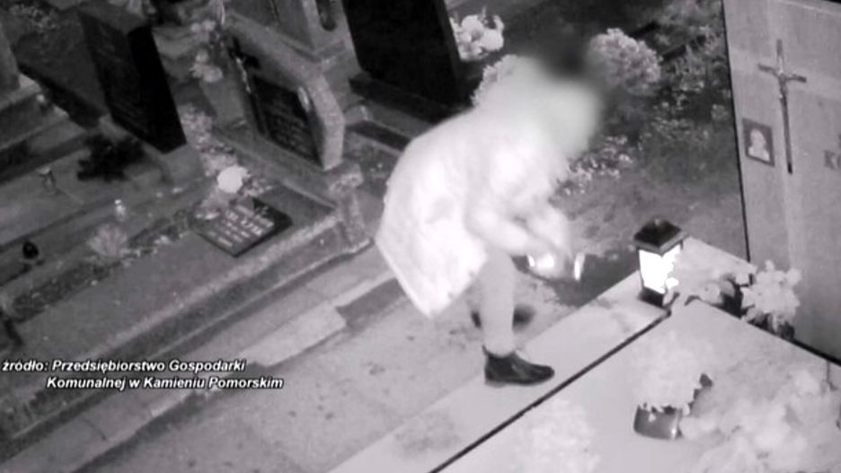 Policjanci z Kamienia Pomorskiego zatrzymali 61-letnią Wiesławę P. po tym, jak jeden z mieszkańców nagrał kobietę, jak okrada nocą groby. Kobieta okazała się pracownikiem w jednej z kamieńskich plebanii. Śledczy ustalili, że, kobieta skradzione przedmioty sprzedawała. Kobieta usłyszała zarzut popełnienia przestępstwa przez ograbienie grobu. Grozi za to kara od 6 miesięcy do 8 lat pozbawienia wolności. Na policję wciąż zgłaszają się kolejne poszkodowane osoby.