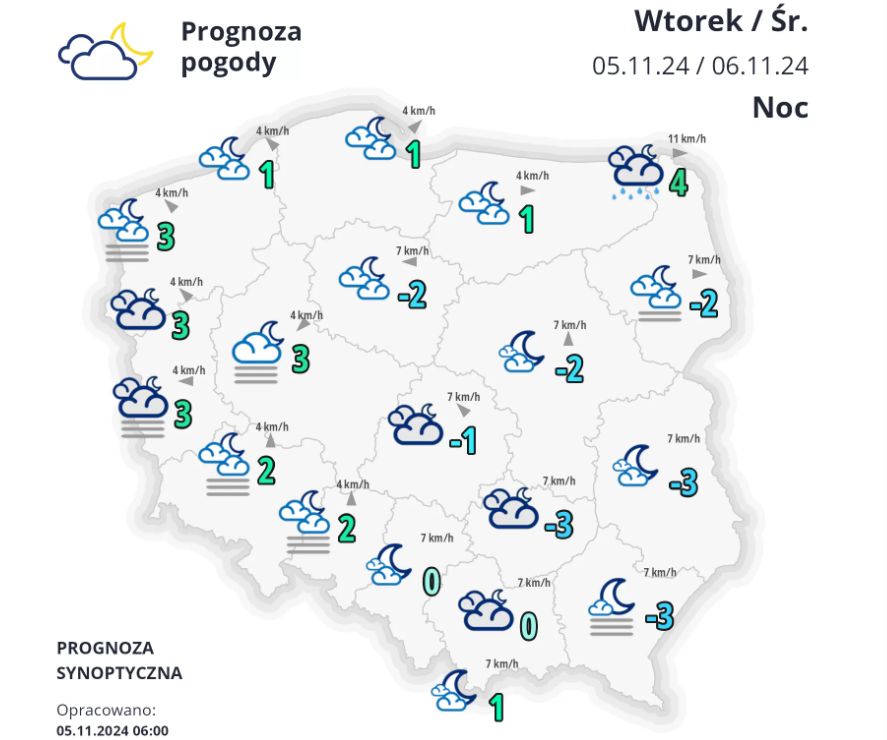 Najbliższej nocy średnia temperatura wyniesie od 3-4 st. C na zachodzie i północnym wschodzie, do -3 na południu kraju.
