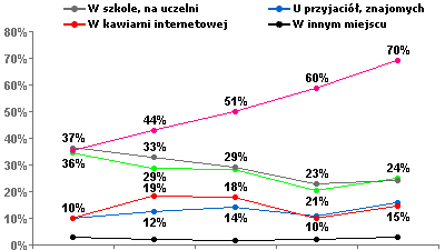 Cztery lata temu jedynie 36% Internautów korzystało z Internetu w domu. Równie popularnymi miejscami korzystania z sieci było miejsce pracy (36%) oraz szkoła lub uczelnia (37%). Obecnie tylko 24% Internautów korzysta z sieci w pracy, tyle samo w szkole lub na uczelni. Zdecydowanie najwięcej, bo aż 70% Internautów korzysta z Internetu we własnym domu.