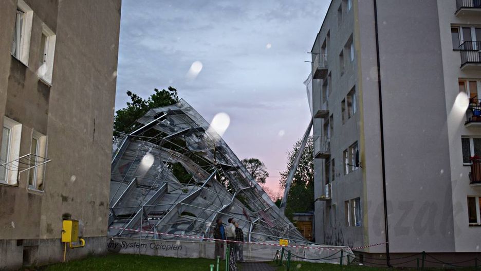 Ogromne rusztowanie runęło na plac zabaw w Płońsku. Uszkodziło również balkony w mieszkaniach znajdujących się w pobliżu. Nikomu nic się nie stało.