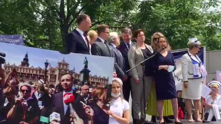 Spotkanie rozpoczęła minuta ciszy, poświęcona pamięci pracowników placówek medycznych, którzy stracili życie w dobie pandemii koronawirusa. To, jak mówią demonstrując pielęgniarki, pół tysiąca istnień. Zanim lekarze i pielęgniarki otrzymali ochronę w postaci szczepionek, narażali swoje życie i często tracili je na skutek zakażenia.