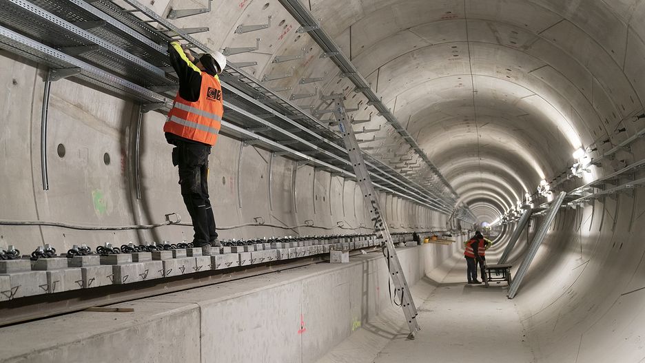 Dopiero po "wypoziomowaniu" tunelu można przystąpić do budowy właściwego torowiska, które składa się ze zbrojenia, warstw wibroizolacyjnych, specjalnych bloczków mocujących oraz szyn. Najpierw układana jest warstwa wibroizolacji, następnie zbrojenie, a na nim montowane są bloczki z uchwytami na szyny. Po przymocowaniu do nich szyn całość jest regulowana z dokładnością do 1 mm, by następnie torowisko można było zalać betonem. Po zakończeniu budowy całego torowiska na odcinku będzie ono jeszcze szlifowane.