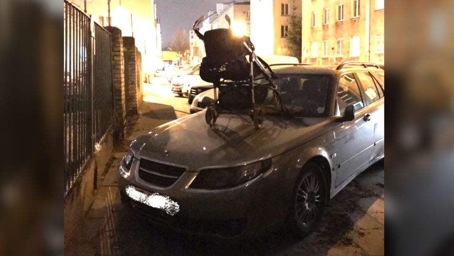 W czwartek wieczorem na facebookowej grupie Święte Krowy Warszawskie ktoś wrzucił fotografię samochodu zaparkowanego w pobliżu skrzyżowania ul. Różanej z Grażyny. Po bliższym przyjrzeniu się można zauważyć pewien niepasujący element. Na masce saaba ktoś ustawił dziecięcą spacerówkę. To prawdopodbnie kara za zagrodzenie chodnika pieszym.